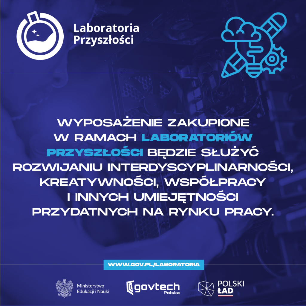 W tym roku szkolnym nasza szkoła przystąpiła do programu – Laboratoria Przyszłości. Celem jego jest budowanie kompetencji miękkich i technicznych wśród uczniów. Otrzymaliśmy wsparcie finansowe na zakup wyposażenia technicznego niezbędnego do rozwoju umiejętności praktycznych wśród dzieci i młodzieży.
